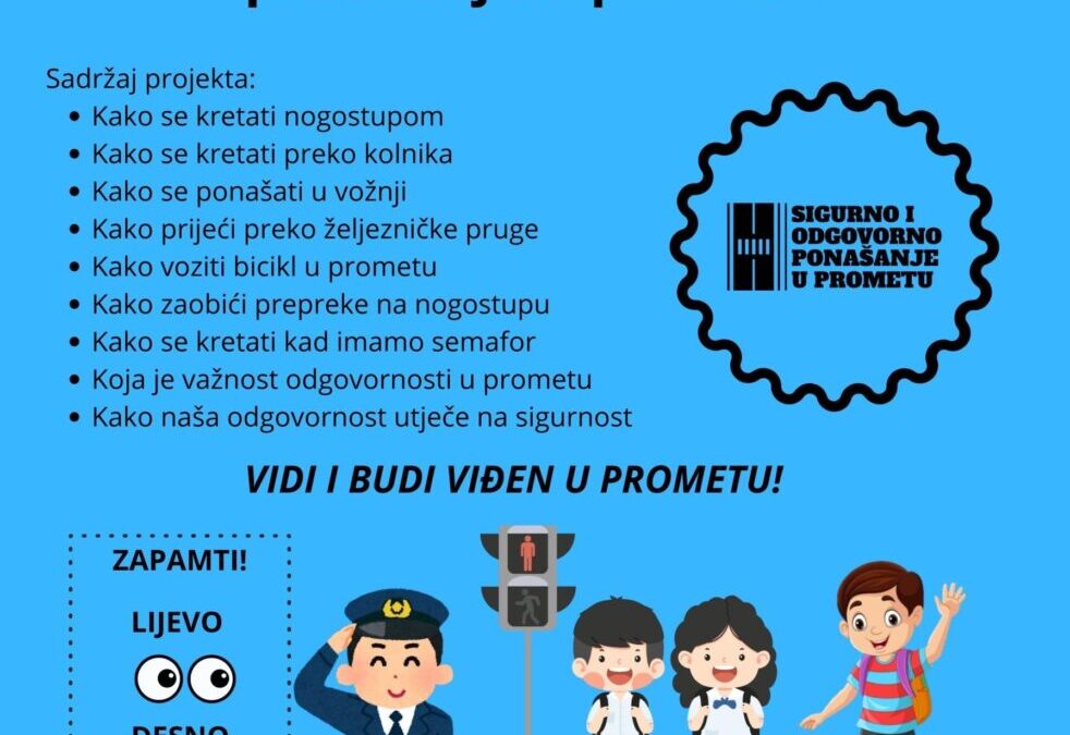 Ove školske godine u našoj se školi provodi preventivni projekt „Edukacija djece o sigurnom i odgovornom ponašanju u prometu“ koji je u cijelosti financiran sredstvima Ministarstva znanosti, obrazovanja i mladih putem Poziva za financiranje preventivnih projekata osnovnih i srednjih škola te učeničkih domova u školskoj godini 2025./2026. Voditeljica projekta je Katarina Kedačić-Buzina, učiteljica tehničke kulture i koordinatorica za sigurnost djece i učenika u prometu.