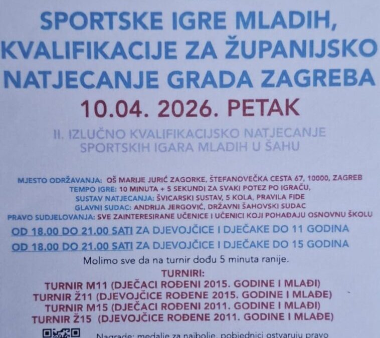 Naša škola uključila se i ove godine u Sportske igre mladih kao domaćin kvalifikacija za Županijsko natjecanje Grada Zagreba u šahu prema rasporedu na letku.