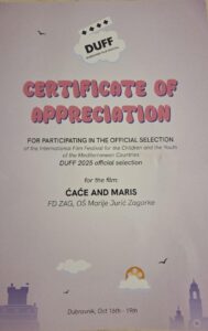 Na Međunarodnom dječjem filmskom festivalu DUFF 2025., koji se održao u Dubrovniku od 16. do 19. listopada, naša škola predstavila se  dokumentarnim filmom „Ćaće i Maris” koji nas upoznaje s našom glumačkom obitelji Mašković i govori o važnosti snova u životu. Film su vrlo uspješno promovirale mlada redateljica Marta Veličković i protagonistica Maris Mašković, obje iz 8.c, sa svojim mentoricama Melitom Horvatek Forjan i Natašom Jakob. Mlade filmašice tom su prigodom dale i brojne intervjue od kojih izdvajamo onaj za DubrovnikTV.